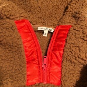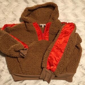 Very good preowned condition. Gently worn with no damage or stains. Super soft sherpa on the inside and out with orange nylon trim on sleeves and neck. Approximate measurements in photos. Please comment with any questions and thank you for looking!