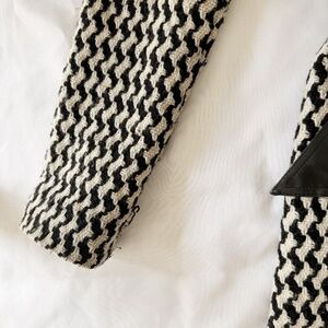 • features: removable (pleather?) belt, side pockets, vented back, shoulder pads, structured a-line silhouette