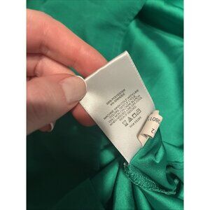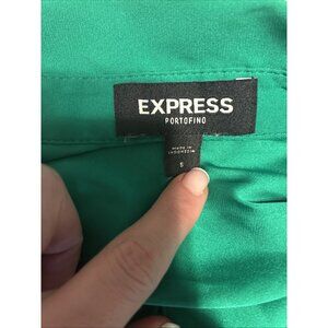 The product is a small size green long sleeve button-down blouse by Express, designed for women. Made from a down fabric, the top features a shamrock design, making it a stylish and unique addition to any wardrobe. With its classic button-up style and perfect fit, this blouse is a versatile piece that can be dressed up or down for any occasion.
