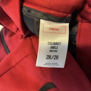 The product is a pair of Express columnist ankle mid-rise pants in a red and black multicolor design. These pants are designed to be a high-rise style with a stretch feature for comfort and flexibility. They are in a size 2 and are tailored for a regular fit, catering to women who prefer a sleek and stylish look. The ankle length of the pants adds a modern touch to the overall design, making them a versatile and fashionable choice for any wardrobe.