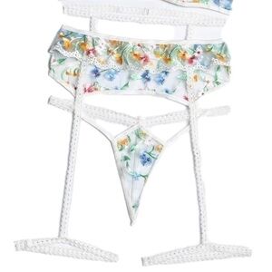 Brand new with tags! This thong & garter set is made with luxury embroidery and transparent materials. Featuring a multi colored embroidered floral detailing. Refer to pictures for measurements. Packaged with care 💖