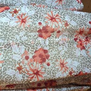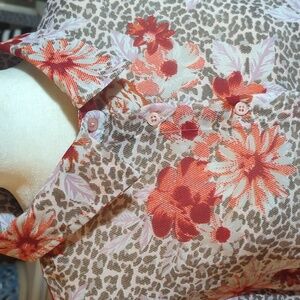 Chic floral button-up blouse with coral flowers in a muted mocha mousse animal print ground. Perfect for a stylish look.
