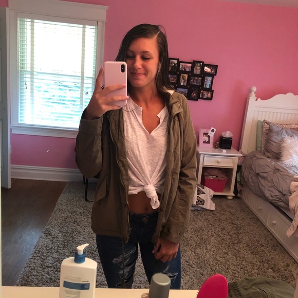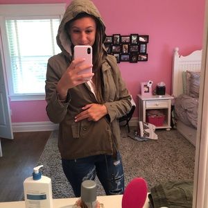 green cargo material fall jacket, fur inside and has a zipper and buttons and 2 pockets