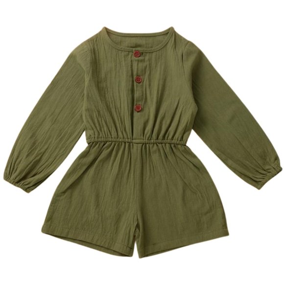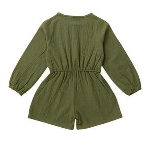 Princess should step into fall with our light weight breezy ready for the weekend romper. Great forest green color prefect to match the fall styles dress it causal or dress it up have fun turning this outfit in to a trendy style. Rock it on the weekend or weekday it doesn't matter it's in season! This romper is true to size wear it with lace up sandals ,sandals, tennis shoes or boots. MODEL IS WEARING A 3/4 SHE IS 37 1/2 IN HEIGHT AND 33LBS GREAT QUALITY .