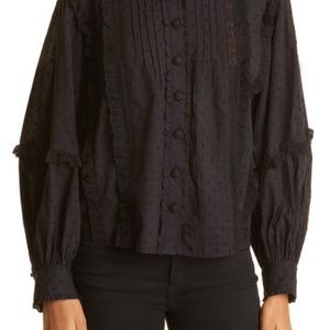 Old-school romance is the mood for this clip-dot blouse detailed in ruffles, lace and pintuck pleats.