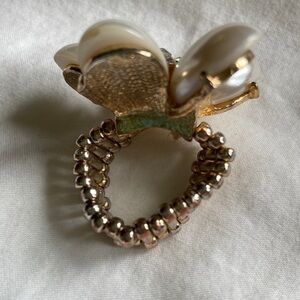 faux Pearl Silver Tone Flower Elastic Floral Ring