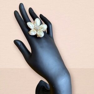 Faux Pearl & Silver Tone Flower Elastic Ring