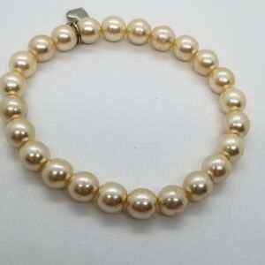 Stretchy faux pearl bracelet in a cream color. Has a small silver-toned heart charm. Beads show a little bit of wear, but nothing major.