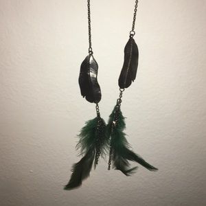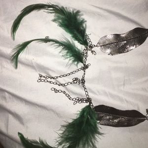metal necklace, teal feathers and little chains hanging as well as two metal feathers, hangs pretty low about mid stomach