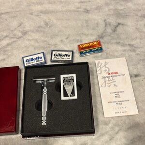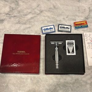 Experience a premium shave with the feathers All Stainless Razor. New, never used. Its sleek red design adds a touch of elegance to your grooming routine.