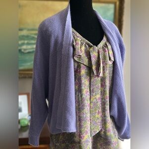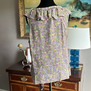 Semi-sheer floral ruffle V-neck top. Purple and green floral pattern with bow detail neckline. EUC.
