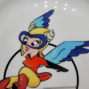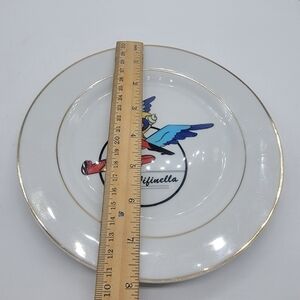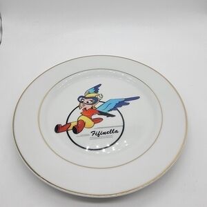 This is a vintage 8" plate depicting a military mascot that was created by the Walt Disney Company. Fifinella was a female gremlin designed by Walt Disney for a proposed film from Roald Dahl's book The Gremlins. During World War II, the Women Air Force Service Pilots (WASP) asked permission to use the image as their official mascot, and the Disney Company granted them the rights.