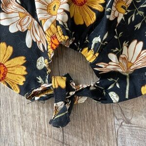 Handmade surgical cap featuring white and yellow daisies. Interior satin-like lining. Tie closure with button placement to secure mask straps