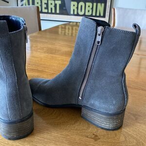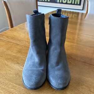 In good condition. Gray suede upper with a 1.5” stacked heel. One small spot on vamp: