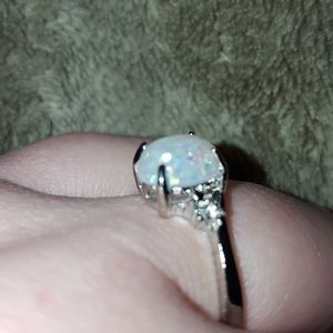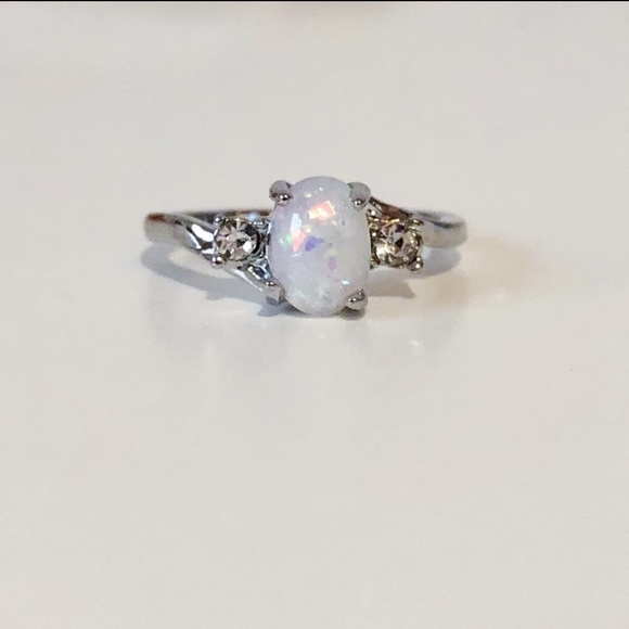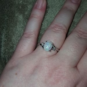 oval fire opal ring with diamonds on each side and silver band