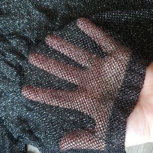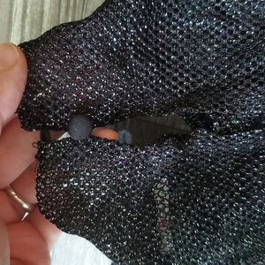 super cute black gold sparkley fishnet top; good condition; **is missing 2 buttons for clasp in the back**