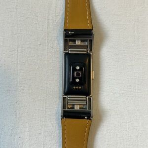 - includes four watch bands (black leather w/silver hardware, tie dye w/silver hardware, deep purple w/silver hardware, gold metal w/gold hardware)