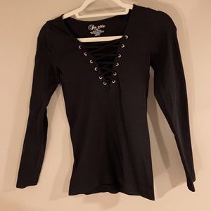 this nylon shirt is fitted and has a trendy criss cross detail!