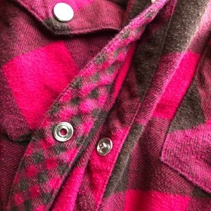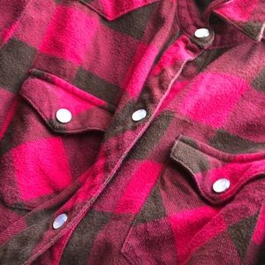 red and brown flannel with snap buttons