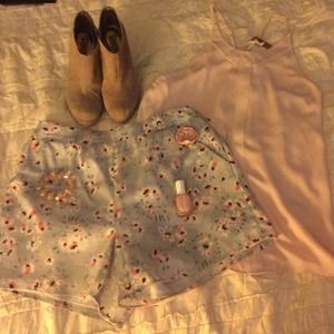 High waisted floral shorts paired with this cream racer back collared stripe tank top. Sold as a outfit or buy separate
