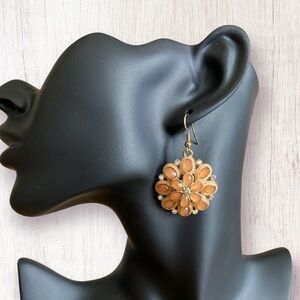 Floral design circular pendant earings with melon-color beads and small rhinestones on gold-tone. The earrings measure approximately 1.75" long.