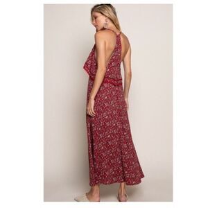 Floral Ruffle Maxi Dress Featuring Red Base with Ivory and Navy floral print. Designed in a maxi relaxed fit with Flowy Ruffle Detail On Bust And Back with Lace Trim sewn on edge, Low V- Neck Line with Adjustable traps , and finished with zipper closure on back.