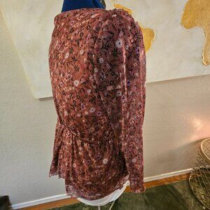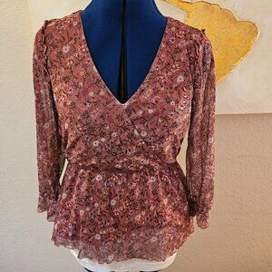 Fall Floral blouse with faux wrap front and ruffle detail sheer sleeves and elastic waist