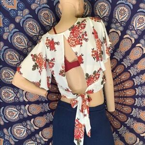 Express brand size small floral crop top light and airy bell sleeve keyhole back with bow new without tags