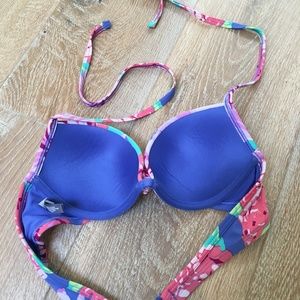 This aerie bikini top is super comfortable and supportive. It clasps in the back with three settings to make it tighter/looser. It ties around the neck in a halter-top style. size 32A.