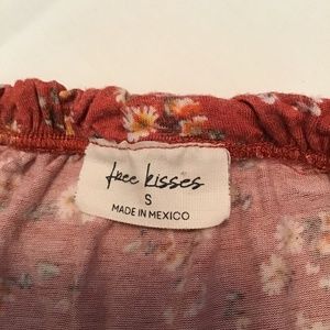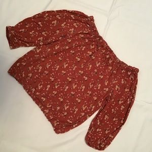 floral shirt with fake buttons applied going down the middle with ruffles on the neck and 3/4 sleeve