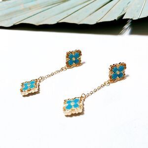 Blue flower dangle drop earrings in gold tone