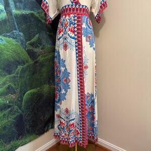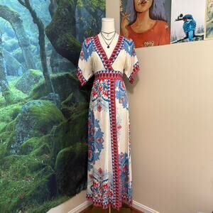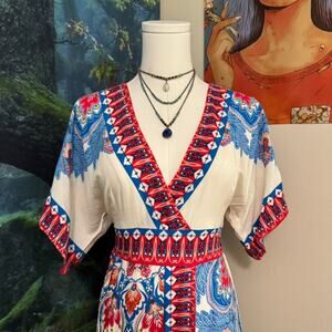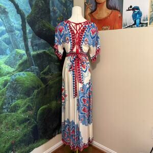 description: boho maxi dress featuring a bold red, blue, and cream floral print with wide short sleeves, deep v-neckline, and a lace-up tie back with waist sash detail. flowy + flattering, perfect for summer festivals, vacations, or casual outings.