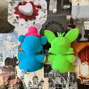 includes blacklight neon green foxy and blacklight neon blue freddy fazbear