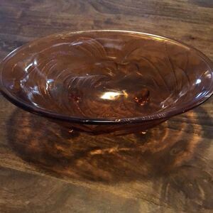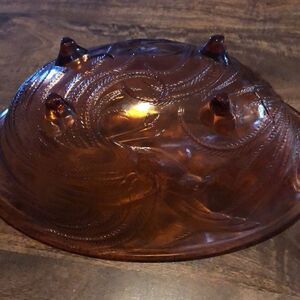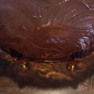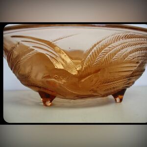 Glass is orangish brown. Gorgeous detail with 2 birds and long grassy leaves. 13" x 9" x 4". No chips or cracks.