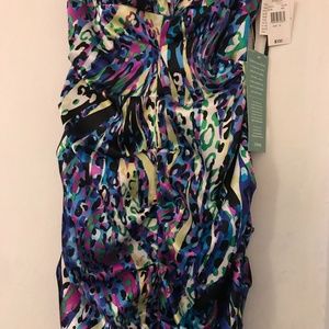 spaghetti strap, deep v-neck, padded cups, ruched mid-section front and back, back zipper, empire waist, mermaid flair bottom skirt