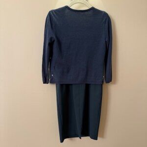Radiate elegance and charm in this chic, versatile outfit! Elevate your wardrobe with this stunning, Laundry form-fitted dress in a rich dark lapis blue, size 2. This sleeveless dress features a sleek, flattering silhouette with a subtle 2-inch slit in the back for a touch of elegance and ease of movement. Paired with a matching cropped sweater, lightly adorned with delicate beading, this ensemble adds a hint of sparkle. The dress hits just above the knee, making it versatile for casual weddings, romantic date night dinners, or cocktail parties. Perfect for turning heads with effortless sophistication!