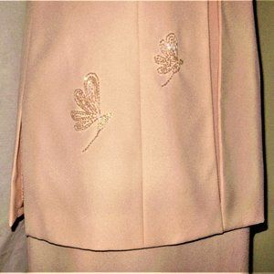 Delicate peach color, this well-tailored outfit is a fancy sophisticate with its bead-&-sequined embroidered butterflies on the jacket - one large on the left shoulder, and a pair of slightly smaller butterflies on the bottom of the front right jacket panel. They are quite beautiful.