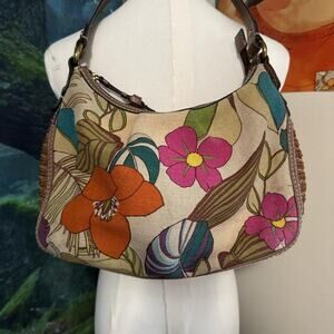 Rare vintage-style Fossil Modern Vintage shoulder bag with bold floral tapestry print and rattan-inspired sides. Features durable leather strap, zip closure, and interior pocket. Fun and functional boho Y2K vibe, perfect for everyday or summer styling.