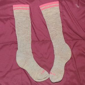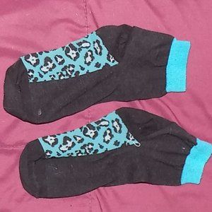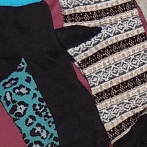 the two on the left side of the photo have never been worn, the turquoise cheetah print is a stretchy probably nylon blend, the fair isle type socks next to them are a wool blend made in Japan ( see my other listing for brand name).