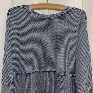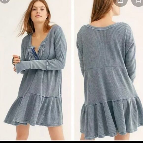 fp XS One Jolene Waffle Knit Stone Washed Blue Tiered Long Sleeve Dress