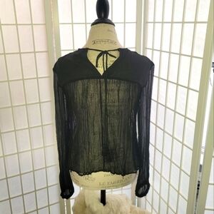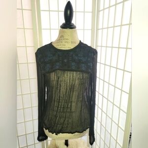 Fun Flirty & Trendy! This sheer blouse is adorned with beading and crochet flowers. Gorgeous details and looped tie neck in back with tassles. Pair with wedges or pumps for an elevated look. Shoes and purse in cover photo are also for sale.