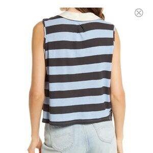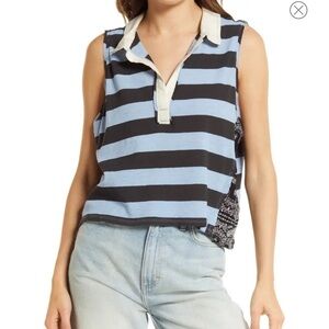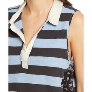 This tank of recycled cotton is patterned with big stripes and paisley insets on the sides. A button free collared neckline and raw-edged seams complete this rugged take on a prep classic.