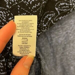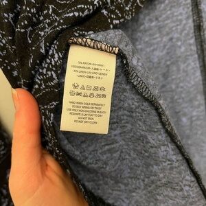Long-sleeved, relaxed fit, semi-sheer material. Cropped in the back and hem reaches the waistline, depending on height. Black shirt with blue floral and butterfly pattern.