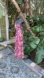 this pretty dress has a light lilac hibiscus floral on a rusty colored background. This is a woven rayon fabric. The spaghetti straps are braided and cross at the back to it deep cut. There is elastic at the back of that skirt. The halter front also ties at the back. Les And easy for summer in excellent condition.