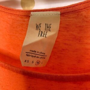 •Features: Orange/red lightweight marled tee with twist shoulder detail. Asymmetrical high low hem.