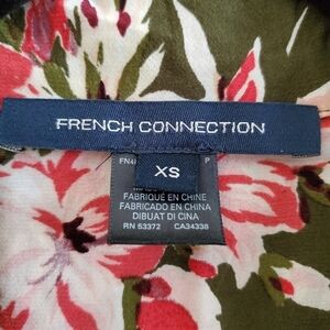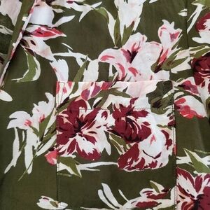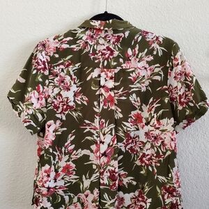 Buttons up to v at neck. Short but not quite crop top short. Bottom buttons can be unbuttoned and tied to make shorter.