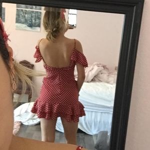 really cute ruffles, light material, NEVER WORN, says size 6 but runs extremely small! I'm a size 2/4 and it's fitted on me