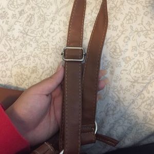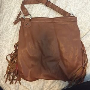 union bay camel colored bag. with adjustable strap. inside is one big compartment and on the sides two pockets and another with a zipper closure