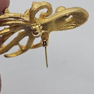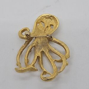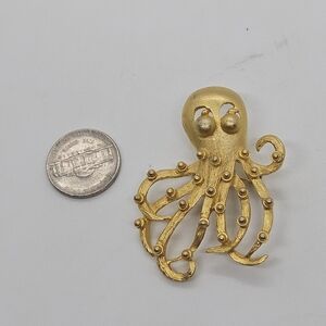 Frosted gold tone brooch shaped like an octopus. In good used condition. Nickel shown for scale, will not be included with your order. Measures approximately 2" long and 1.5" wide