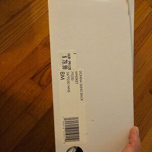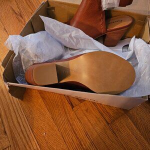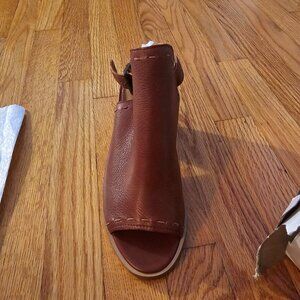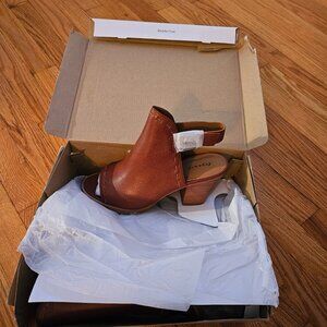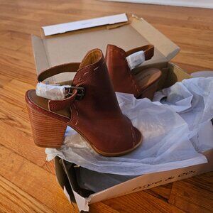 Size 8 brown leather slingback. Chunky, stacked heel, peep-toe and adjustable strap.